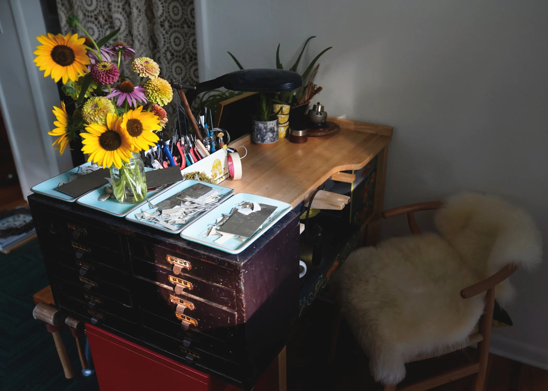 Mostly it was just swapping the corners where my bench and the live edge table sit. But I also needed to make room for my new rolling mill (which I’m very, VERY excited about - even if I’m not totally sure of all the things I’d like to use it for yet). I even put together a vase of flowers from the backyard as a little gift to myself for getting everything put in its place.
